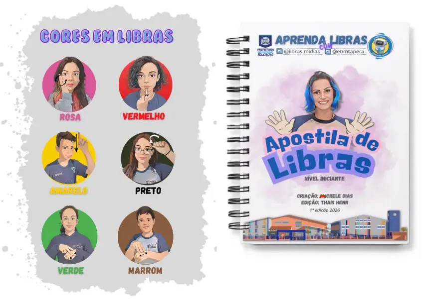 Cada página da apostila é construída com apoio dos alunos, que contribuem com fotos, desenhos e sinais. Essa metodologia reforça o protagonismo estudantil e amplia o interesse pela Libras.