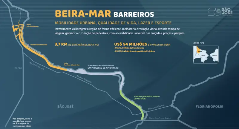 A Beira-Mar de Barreiros posiciona São José como protagonista no cenário metropolitano, oferecendo alternativa viária estruturante para toda a região da Grande Florianópolis. A conexão direta com a BR-101 redistribuirá fluxos de tráfego, aliviando corredores historicamente congestionados. Especialistas em urbanismo apontam que intervenções dessa magnitude catalisam desenvolvimento econômico, atraindo investimentos privados e valorizando imóveis ao longo do eixo viário.