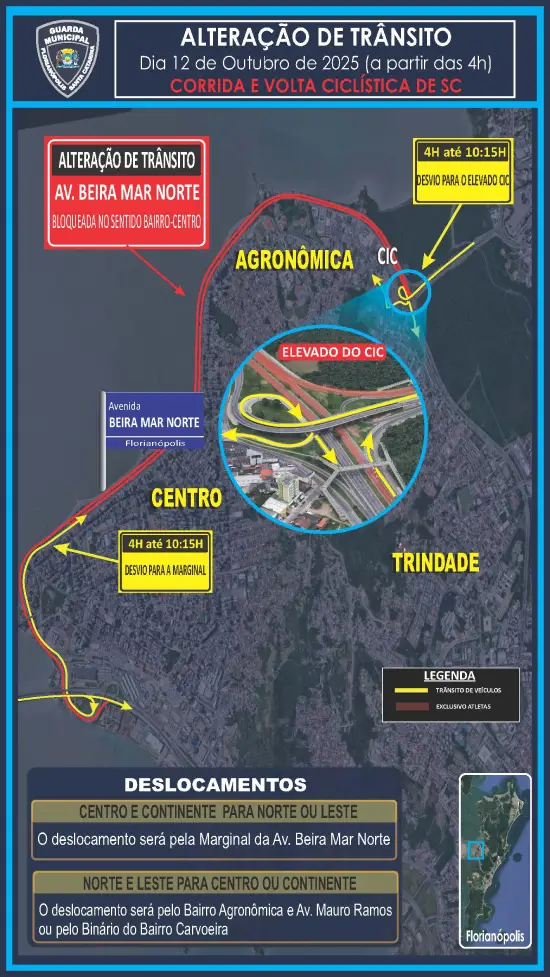 A Avenida Beira-Mar Norte ficará reservada aos ciclistas. O tráfego comum será redirecionado para a marginal, passando pela Rua Desembargador Arno Hoeschl até o elevado do CIC. Condutores vindos do Norte devem seguir pela Agronômica e Avenida Mauro Ramos, enquanto os que se deslocam rumo ao Sul podem optar pelo Binário Pantanal-Carvoeira.