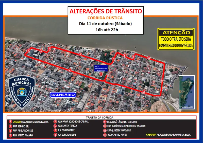 Entre 16h e 22h, o bairro Balneário receberá a Balnica Night Run, com largada na Praça Renato Ramos. O percurso atravessa 15 ruas e será compartilhado com veículos. A Guarda Municipal de Florianópolis fará o controle de tráfego em pontos críticos, utilizando sinalização temporária e agentes a pé.
